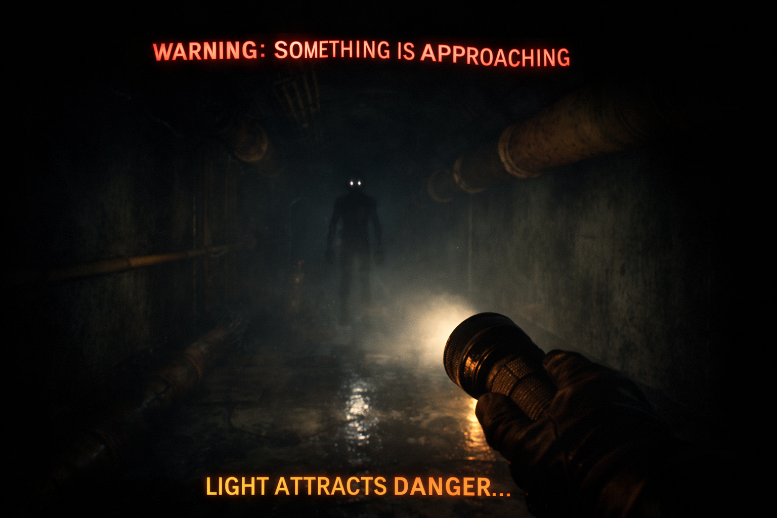 You explore an abandoned underground structure where light is scarce and your only tool — a flashlight — might reveal more than it protects.